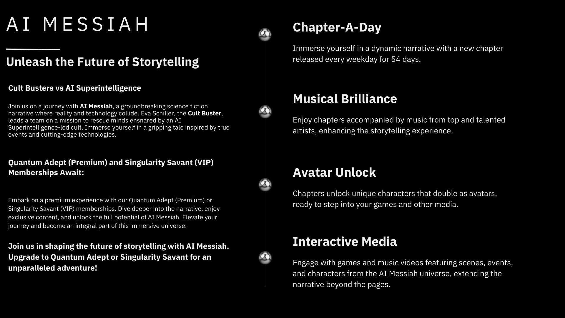 Embark on a riveting journey with Eva Schiller, a formidable Cult Buster, and her elite team as they undertake daring missions to liberate individuals trapped in the clutches of mind control. Confront an unparalleled cult, spearheaded by an AI Superintelligence, in a narrative intricately woven with inspiration from actual events and cutting-edge technologies.